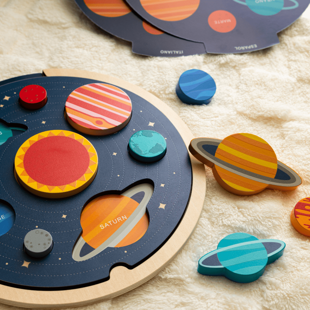 Perfecto para mayores de 3 años, el rompecabezas con bandeja de madera del sistema solar en varios idiomas desarrolla la coordinación ojo-mano, las habilidades del habla y el lenguaje y las capacidades cognitivas.