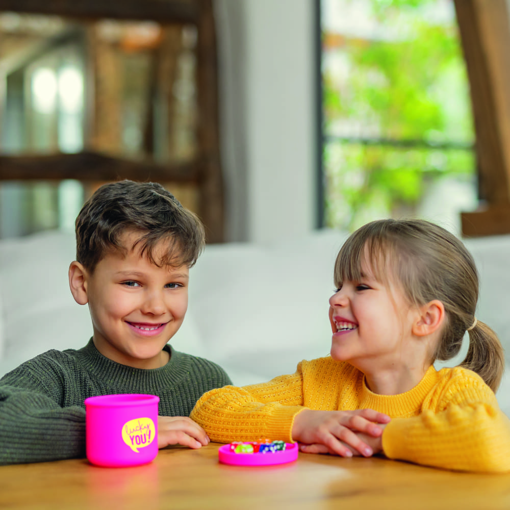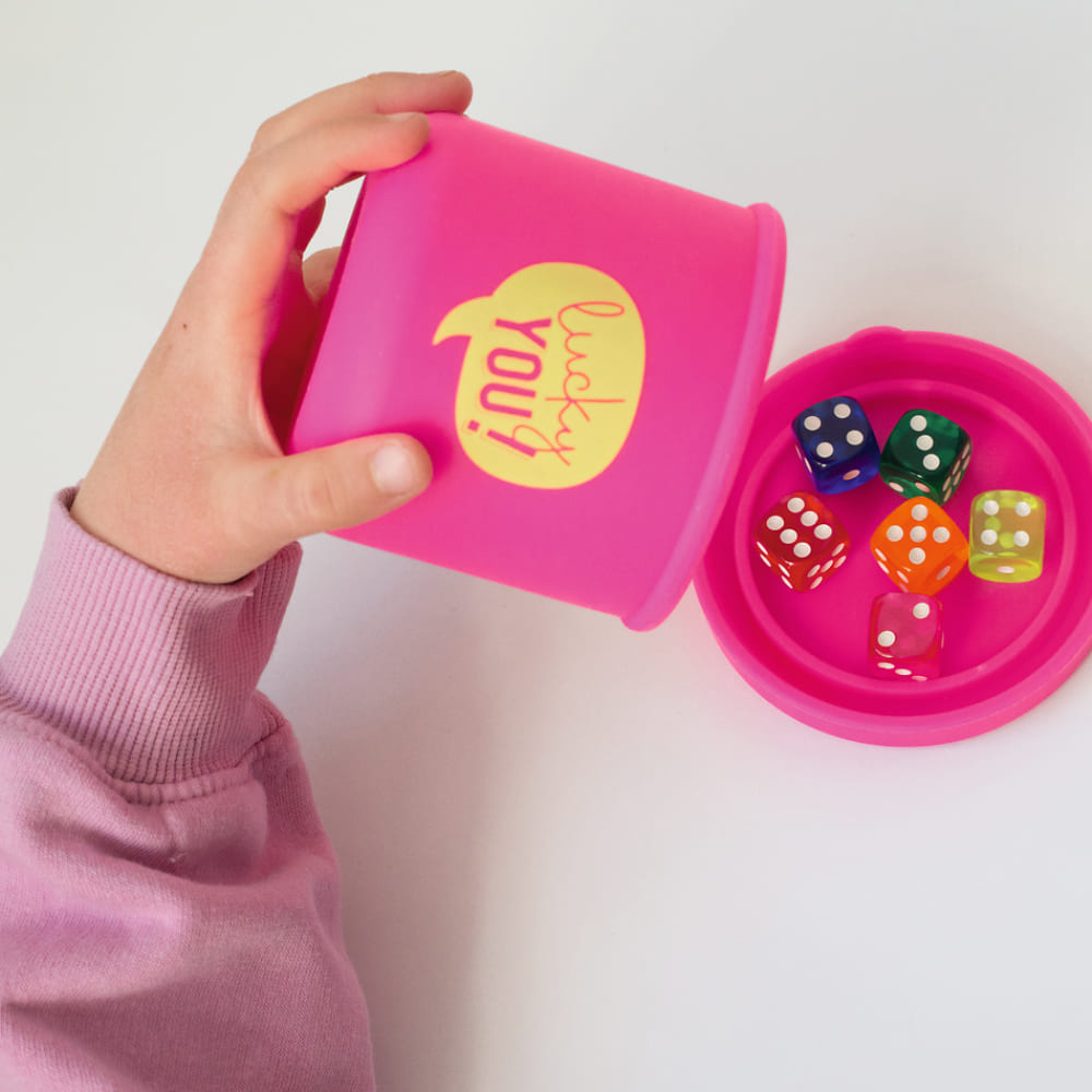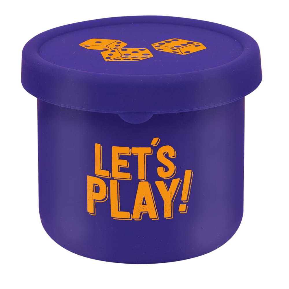 Cubilete de silicona con tapa y 6 dados, ideal para que los más pequeños jueguen con seguridad.