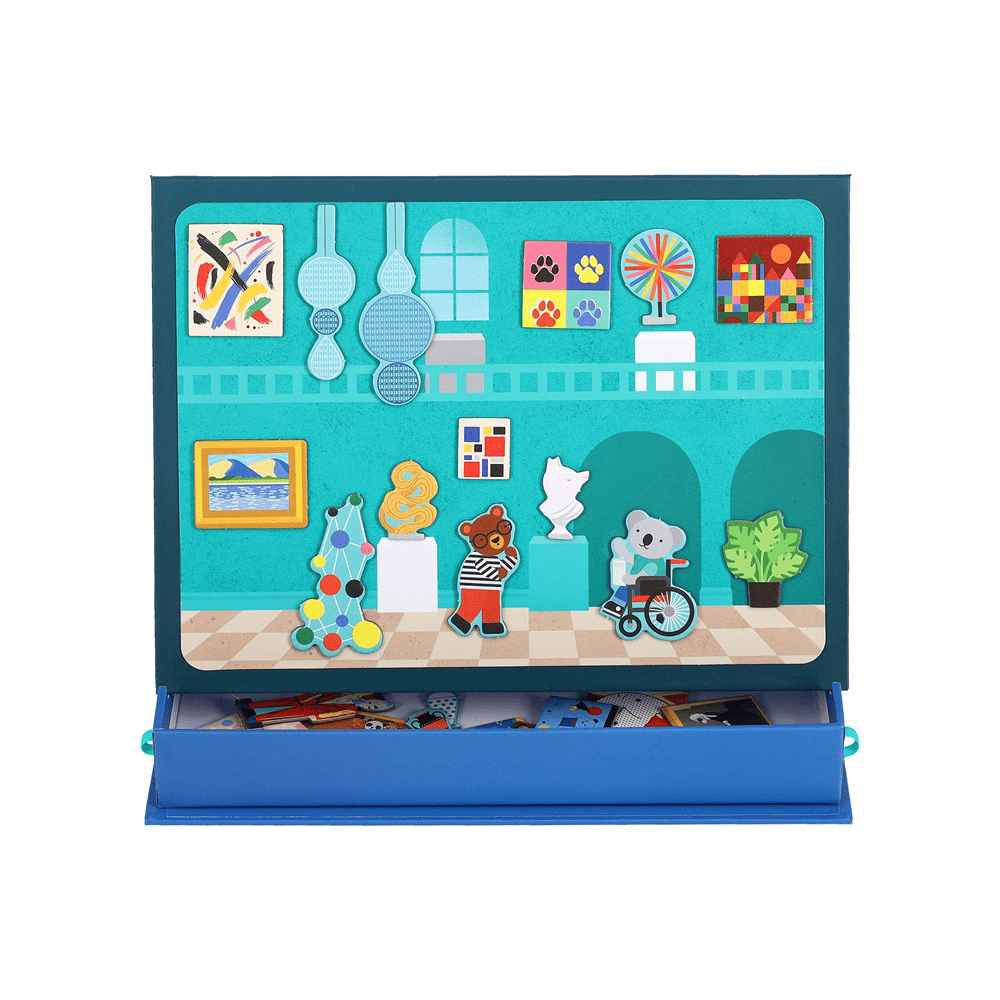 Decora las paredes de la galería con pequeñas obras de arte y crea tu propia colección. Esta caja caballete portátil incluye 2 fondos diferentes y 43 piezas magnéticas para crear innumerables combinaciones de escenas una y otra vez.