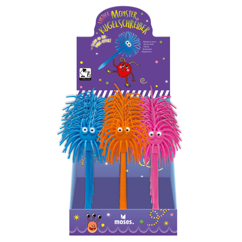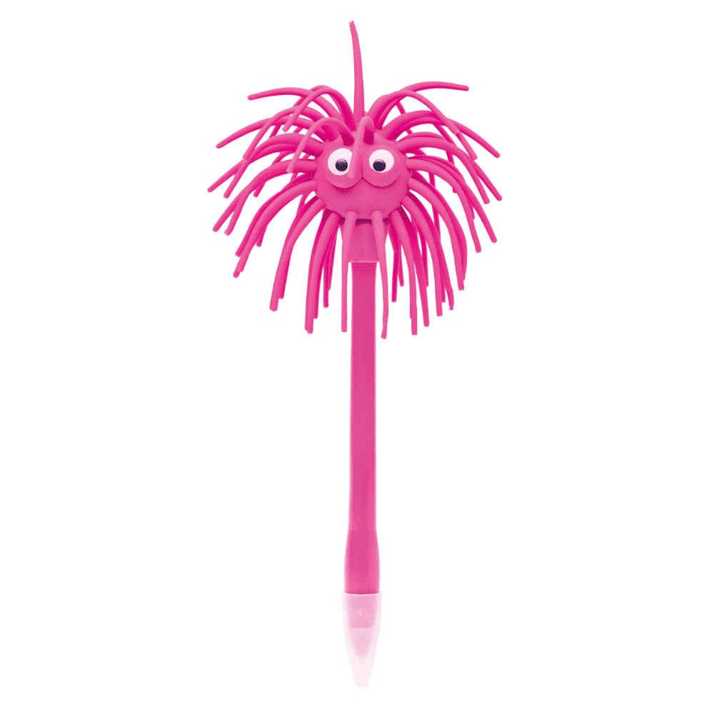 Bolígrafo con pelo gracioso y ojos que brillan en la oscuridad.