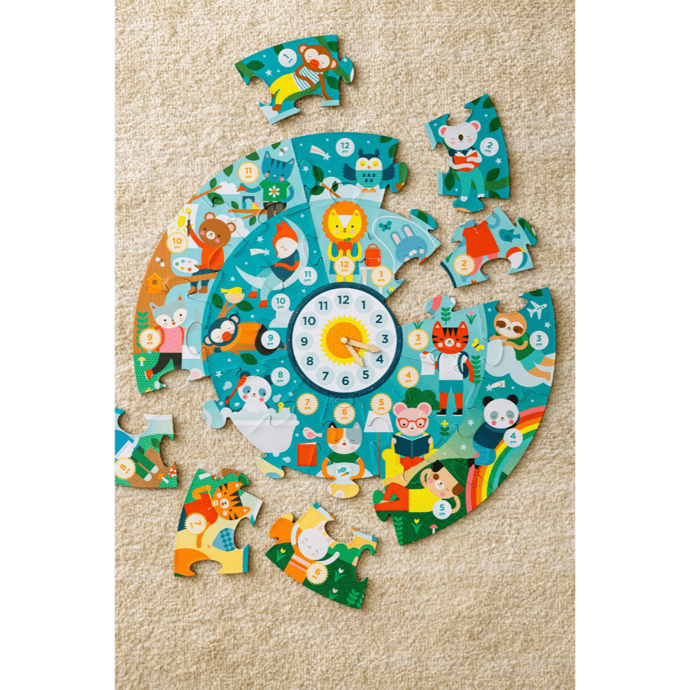 Completa las horas del día y de la noche con los animales divirtiéndose jugando, comiendo y durmiendo. Una vez que el rompecabezas esté completo, usa las manecillas para establecer diferentes horas y